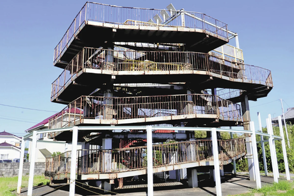 「危険ですので立ち入らないでください」――。今泉海水浴場から直線で約400メートル、徒歩7分ほどの場所にある津波避難タワーには赤文字で注意を促す看板が置かれ、周辺はロープで封鎖されていた。柱や手すりはさびつき、タワーの下には鉄くずが散らばっていた。