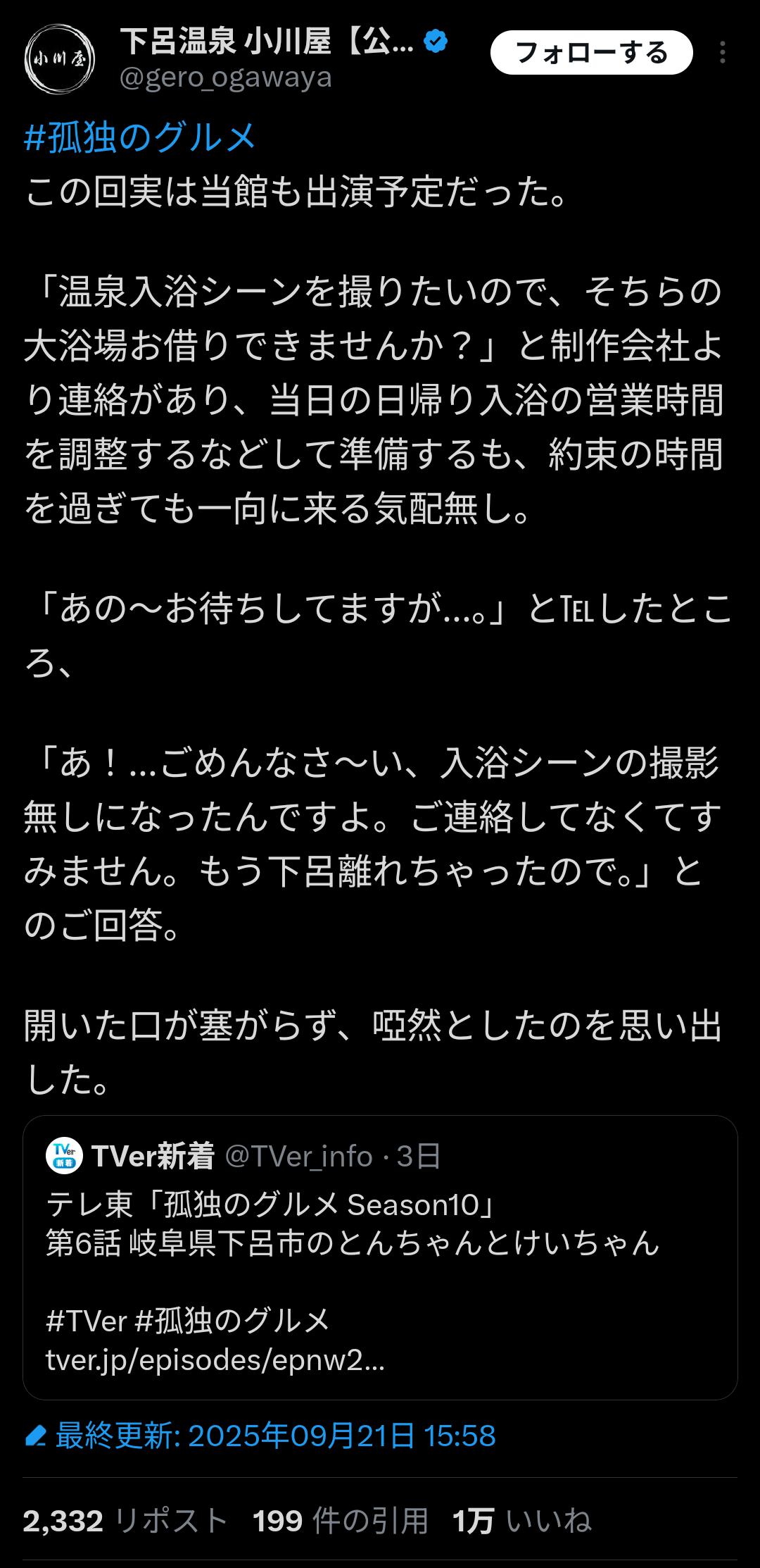 11 :@エンタメ:2025/09/22(月) 11:47:05.44 ID:uKrRx+TP0.net下呂の回か・・・