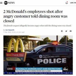 1 :風吹けば名無し:2020/05/09(土) 07:19:45 ID:BFUmG3GR0.net米オクラホマ州の都市・オクラホマシティーのマクドナルドで店内飲食できないと知り激怒した客が発砲、従業員2人が撃たれ1人が負傷した。マクドナルドでは新型コロナウイルスの流行に対応するため店内での食事 ...