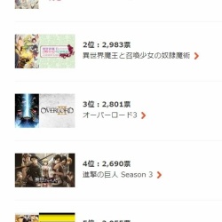 1 :名無しさん@涙目です。:2018/08/08(水) 22:06:56.68ID:7l3QlwAY0●.net2BP(2000)3位『オーバーロードIII』、2位『異世界魔王と召喚少女の奴隷魔術』、そして1位は?「2018夏アニメ人気投票」ランキングが公開!アニメ見放題サービス「dアニメストア」は、2018年の夏ア ...